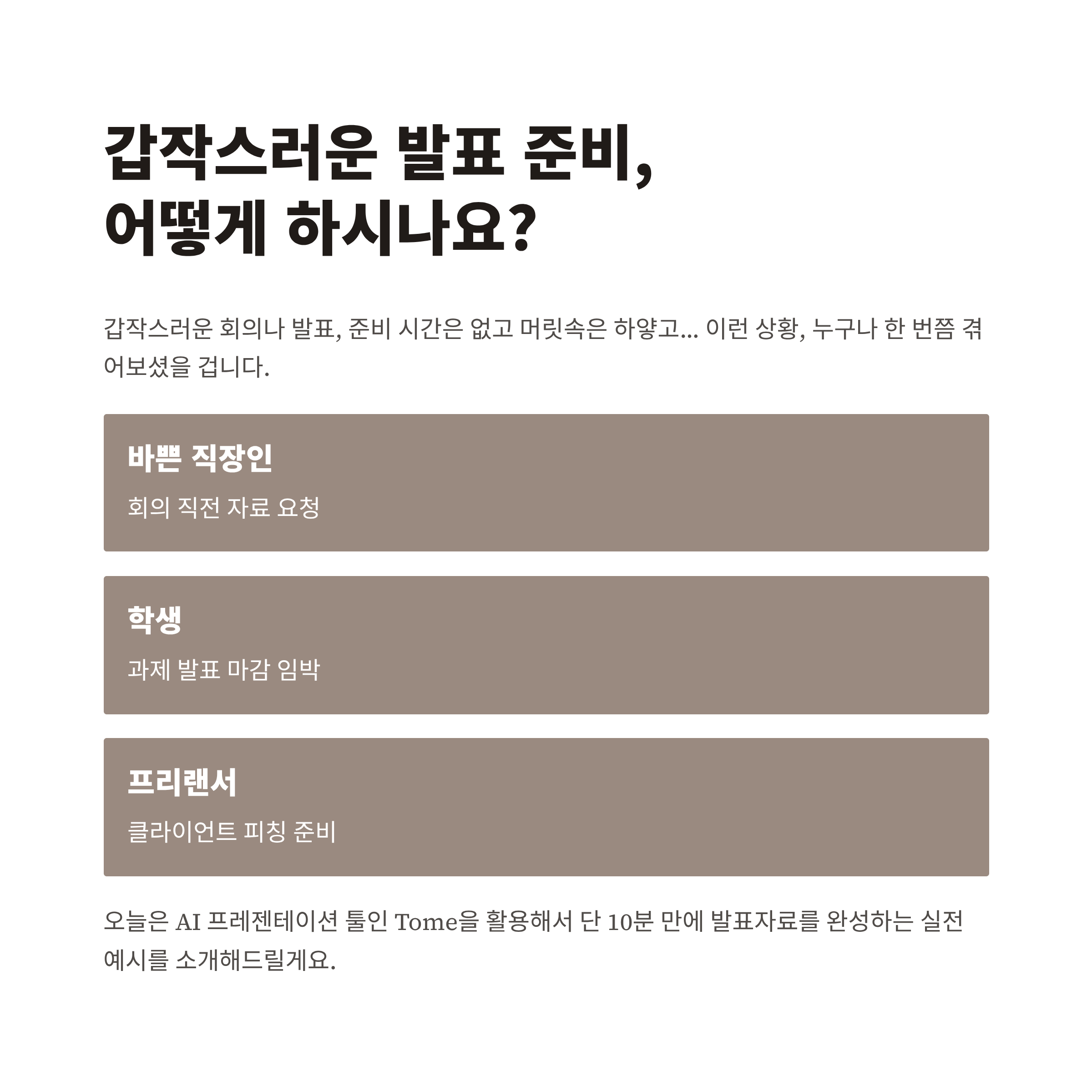 다음 회의나 과제 발표, 오늘 한번 Tome으로 10분 안에 끝내보세요.