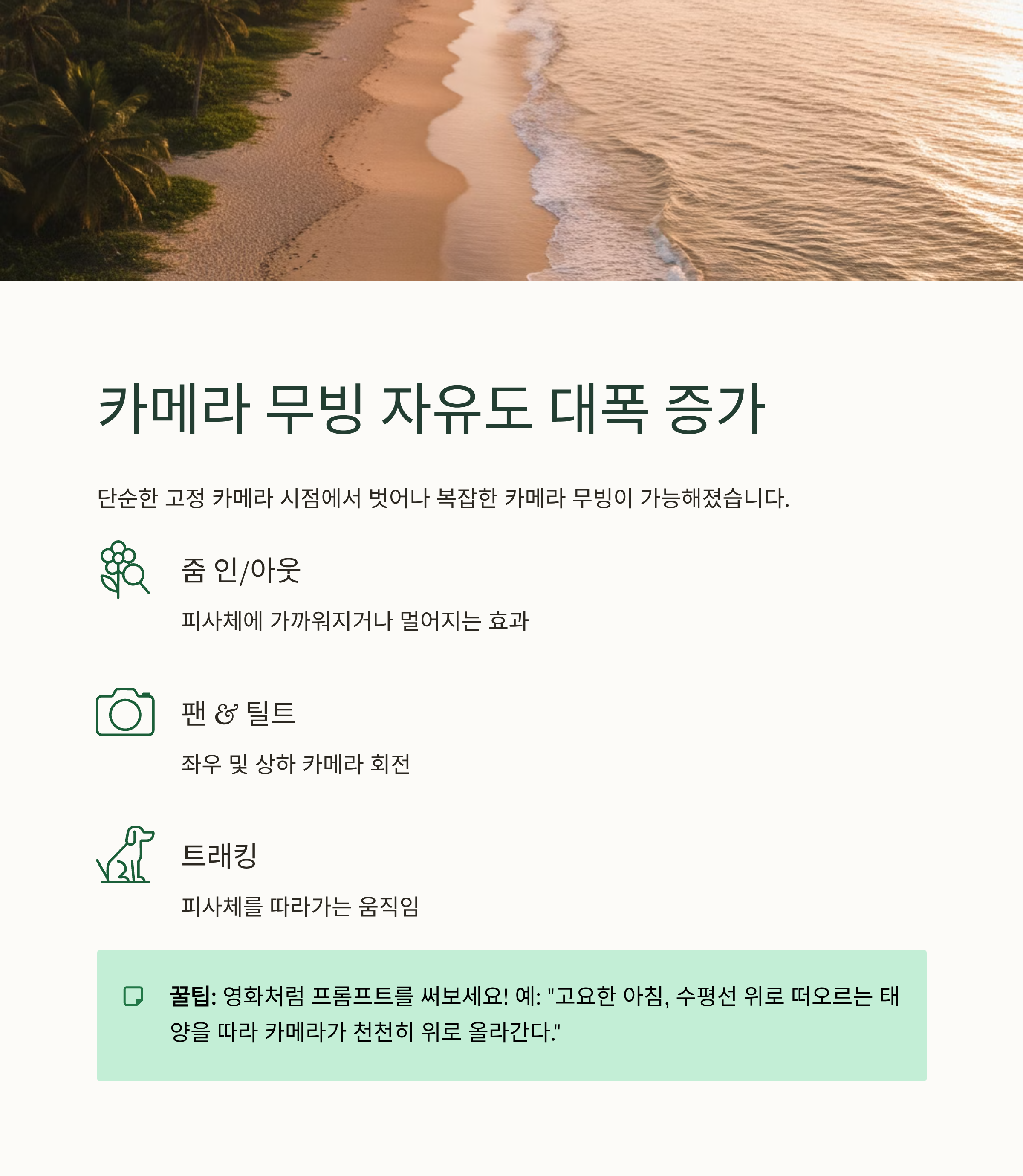 | 멀티샷 지원 | 스토리보드를 먼저 작성한 후 순서대로 프롬프트 입력 |