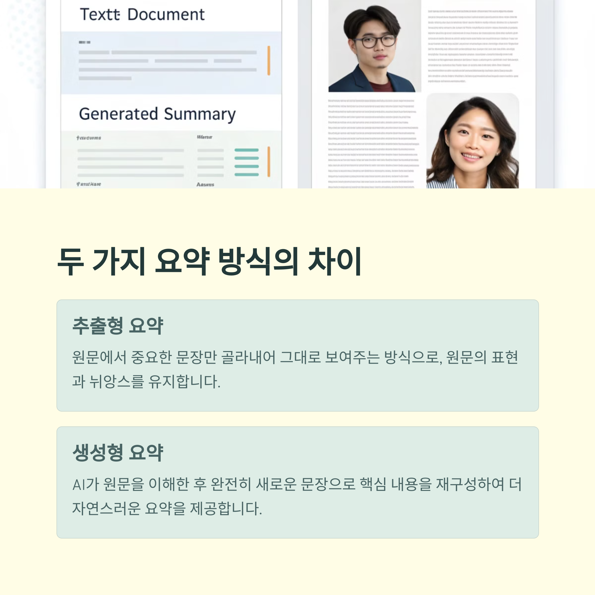 | 기능 | 원문에서 주요 문장 그대로 추출 | 원문 내용을 재구성해 새로운 문장 생성 |