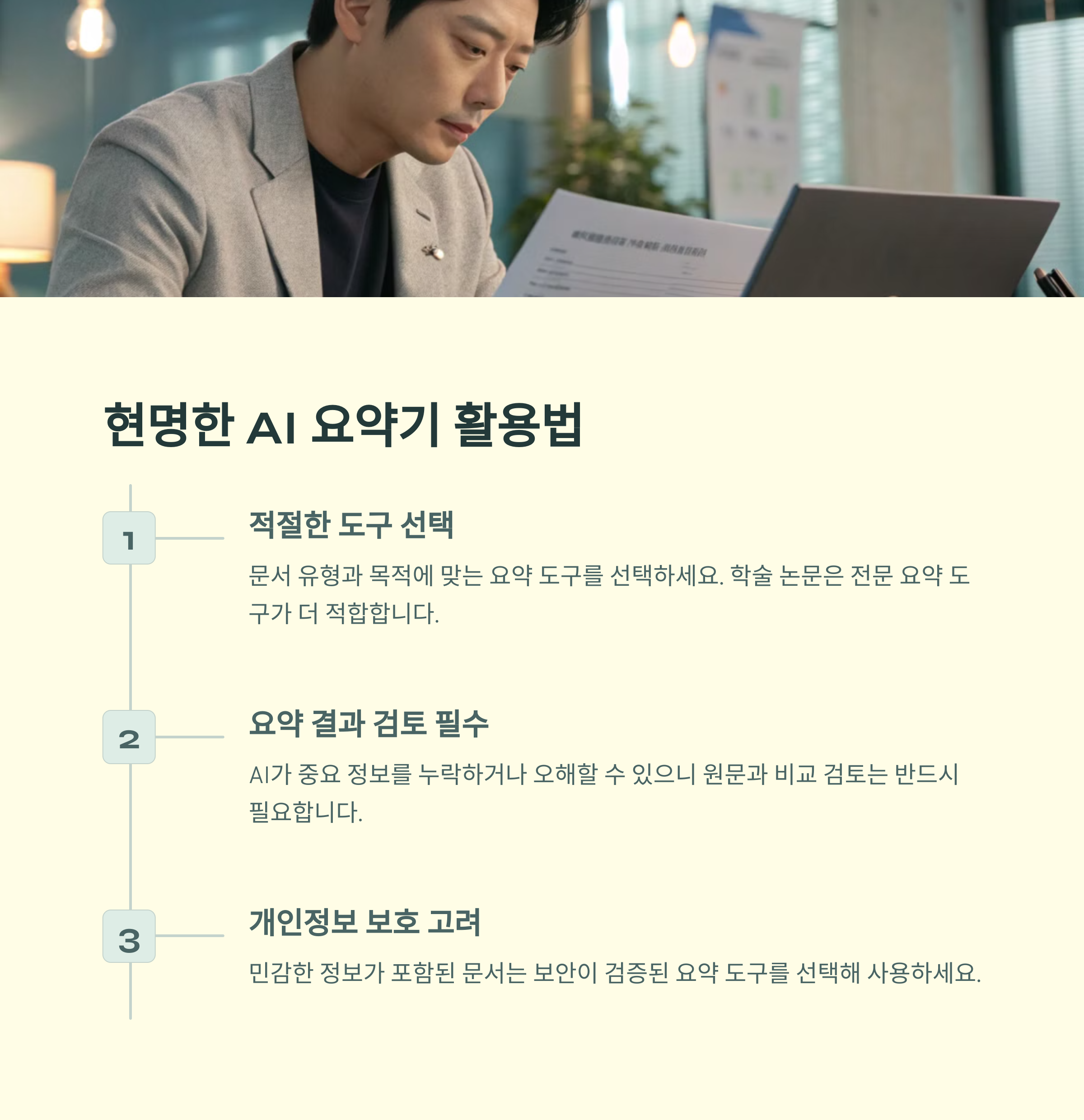 AI 요약기를 잘 활용하려면 몇 가지 팁이 필요해요. 먼저, 요약이 필요한 문서의 성격에 맞는 요약기를 고르는 게 중요해요. 예를 들어, 비즈니스 문서는 ChatGPT나 Notion AI가, 논문은 Scholarcy가 더 적합하죠. 또 요약 전에는 AI가 잘못 이해할 수 있는 부분이 없는지 문서를 간단히 점검하는 것도 좋아요. 그리고 요약본을 받으면 항상 한 번은 직접 검토하면서 다듬어주는 센스! AI도 가끔은 엉뚱하게 요약하거든요.