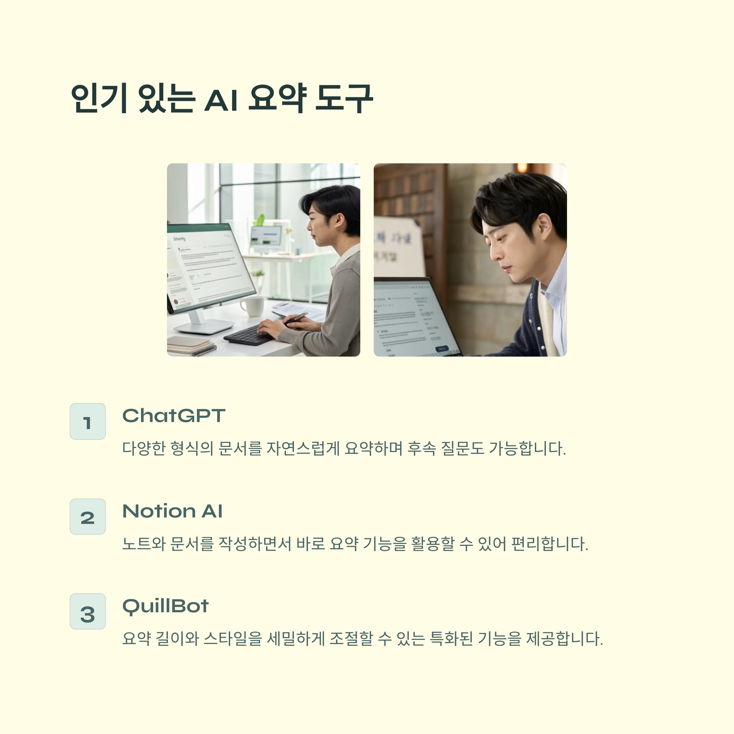 현재 많이 사용되는 AI 요약기 툴은 다음과 같아요. 각 도구의 특징을 살펴볼까요?