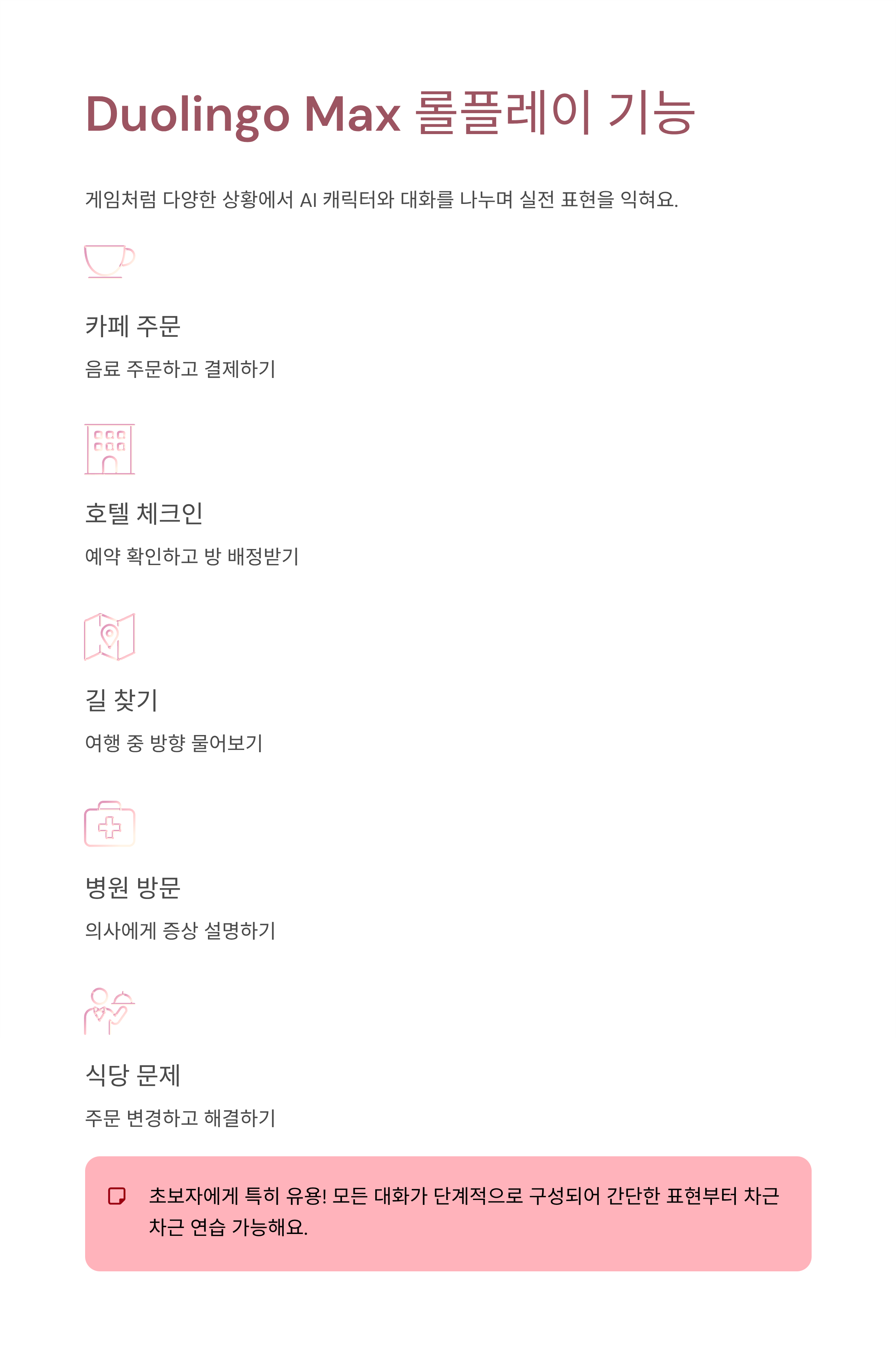 Duolingo Max의 핵심은 ‘롤플레이(Roleplay)’ 기능이에요.