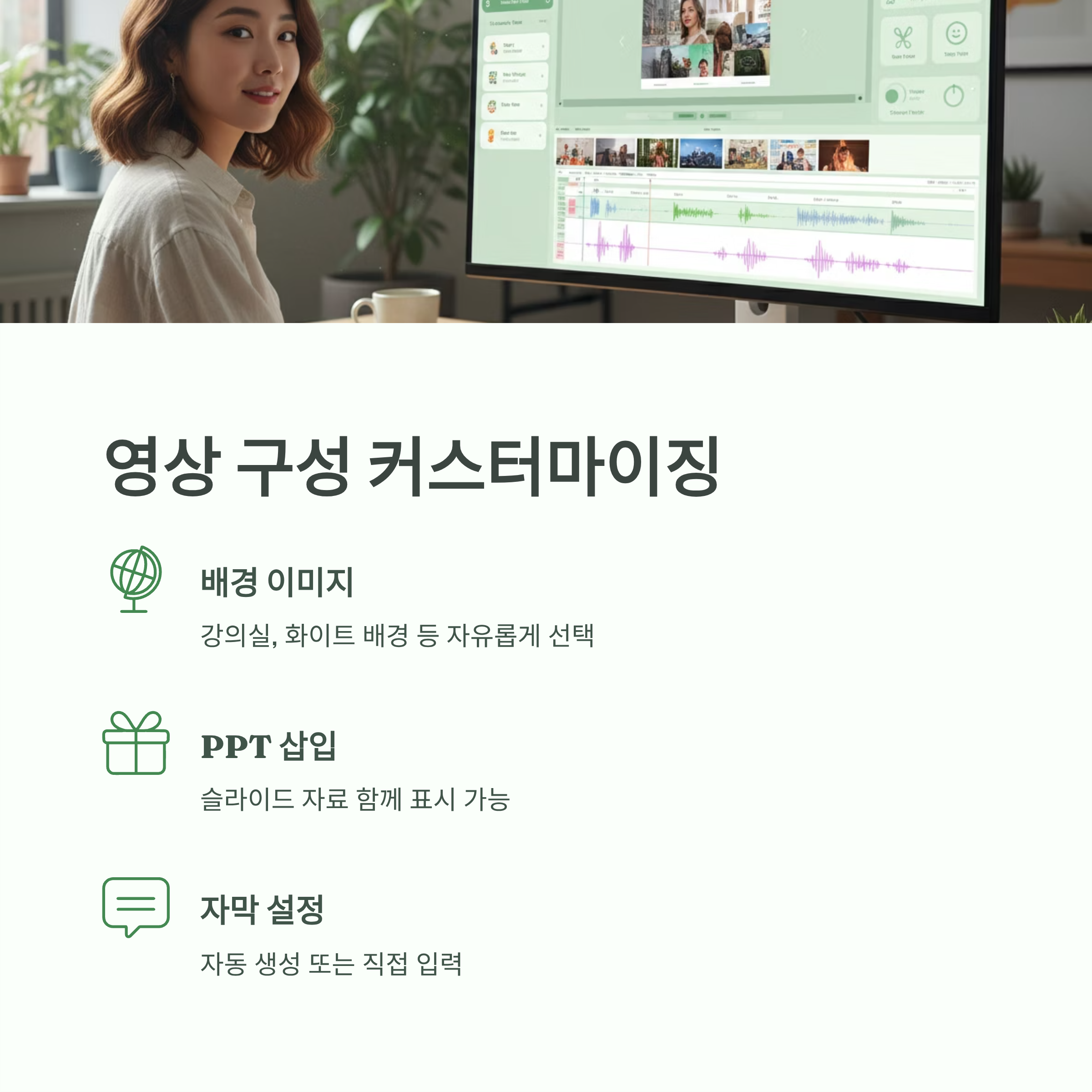 배경 이미지, PPT 삽입, 자막 위치까지 모두 커스터마이징 할 수 있어요.