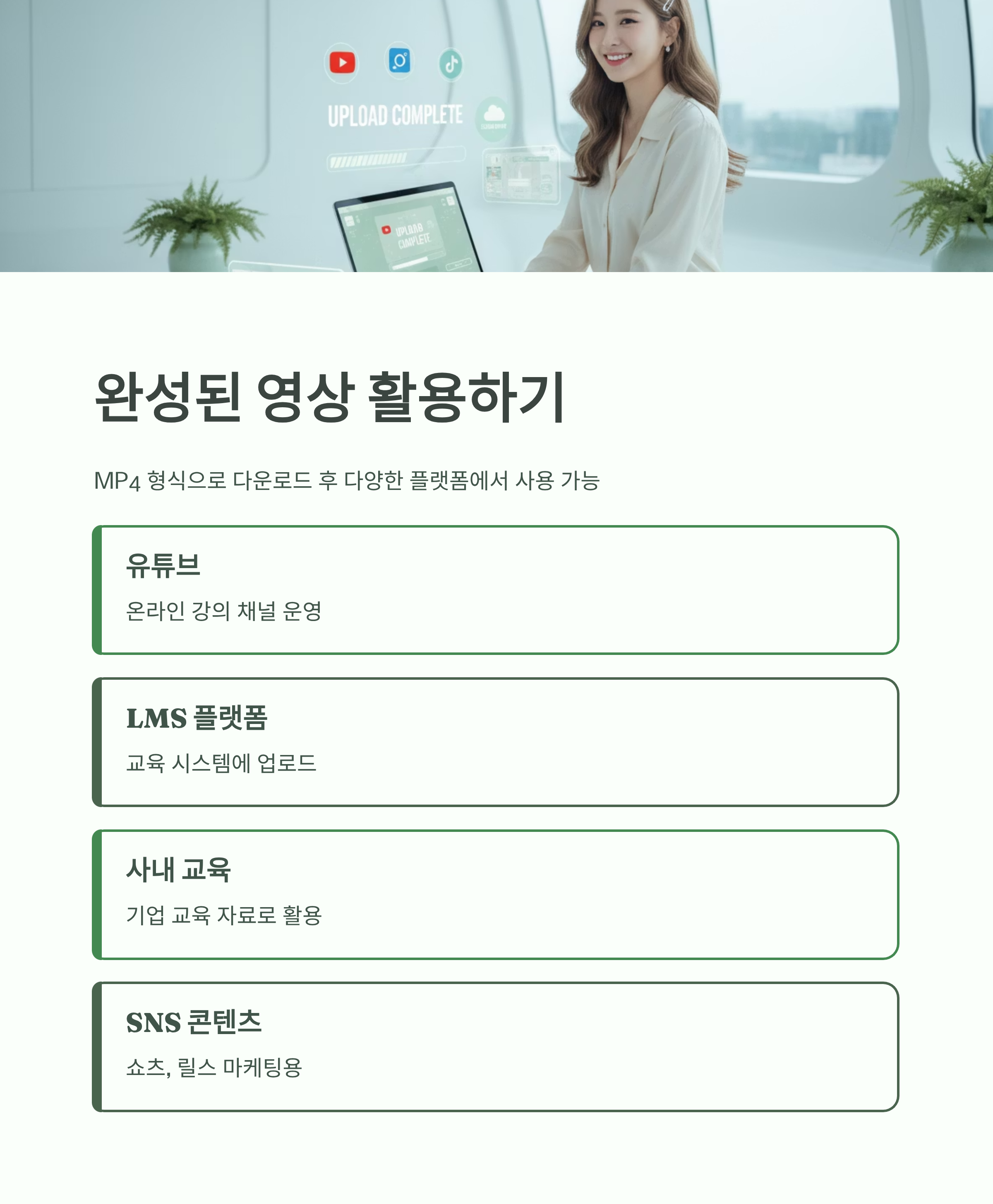 유튜브, LMS 플랫폼, 사내 교육자료 등 다양한 곳에 활용 가능합니다.