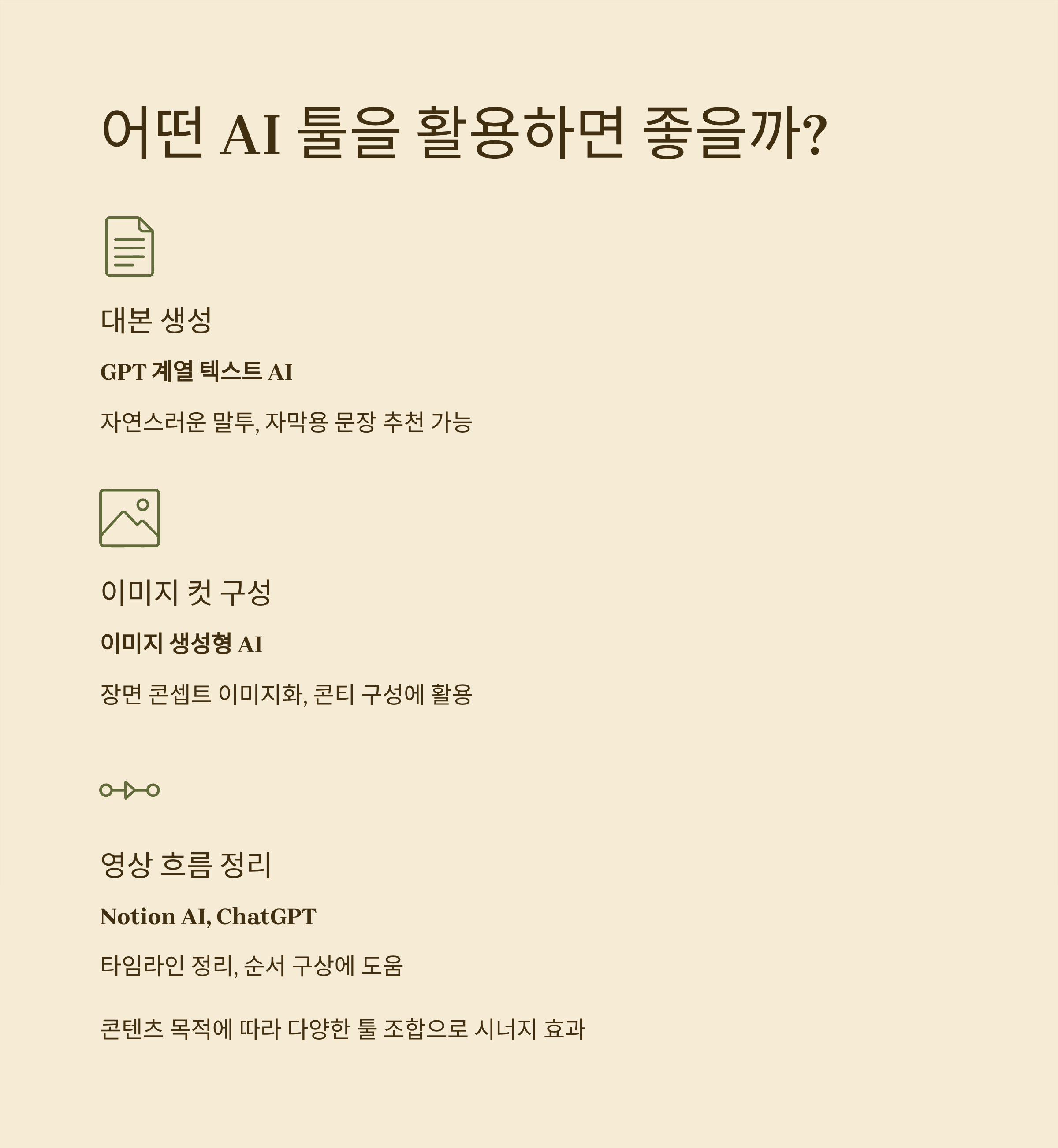| 영상 흐름 정리 | Notion AI, ChatGPT 등 | 타임라인 정리, 순서 구상에 도움 |