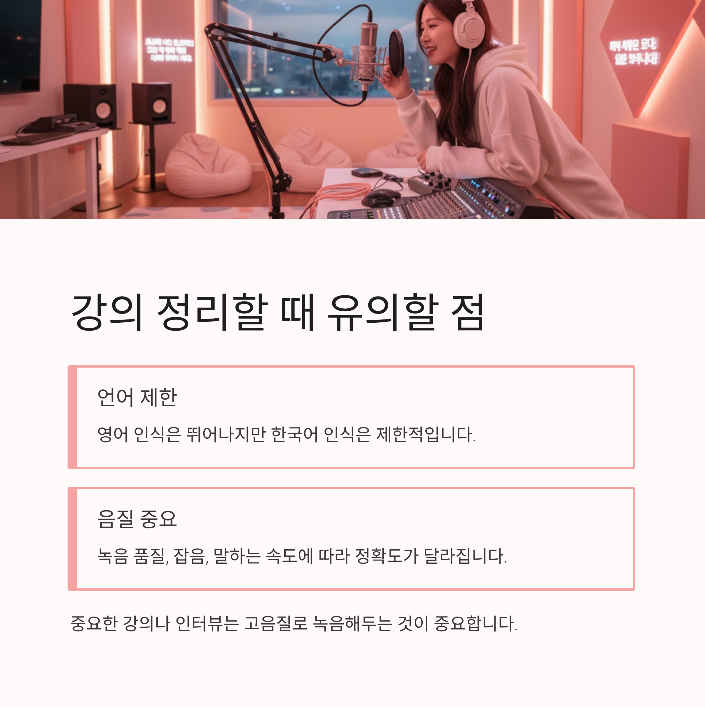 또한 녹음 품질, 잡음, 말하는 속도에 따라 텍스트화 정확도는 달라집니다.