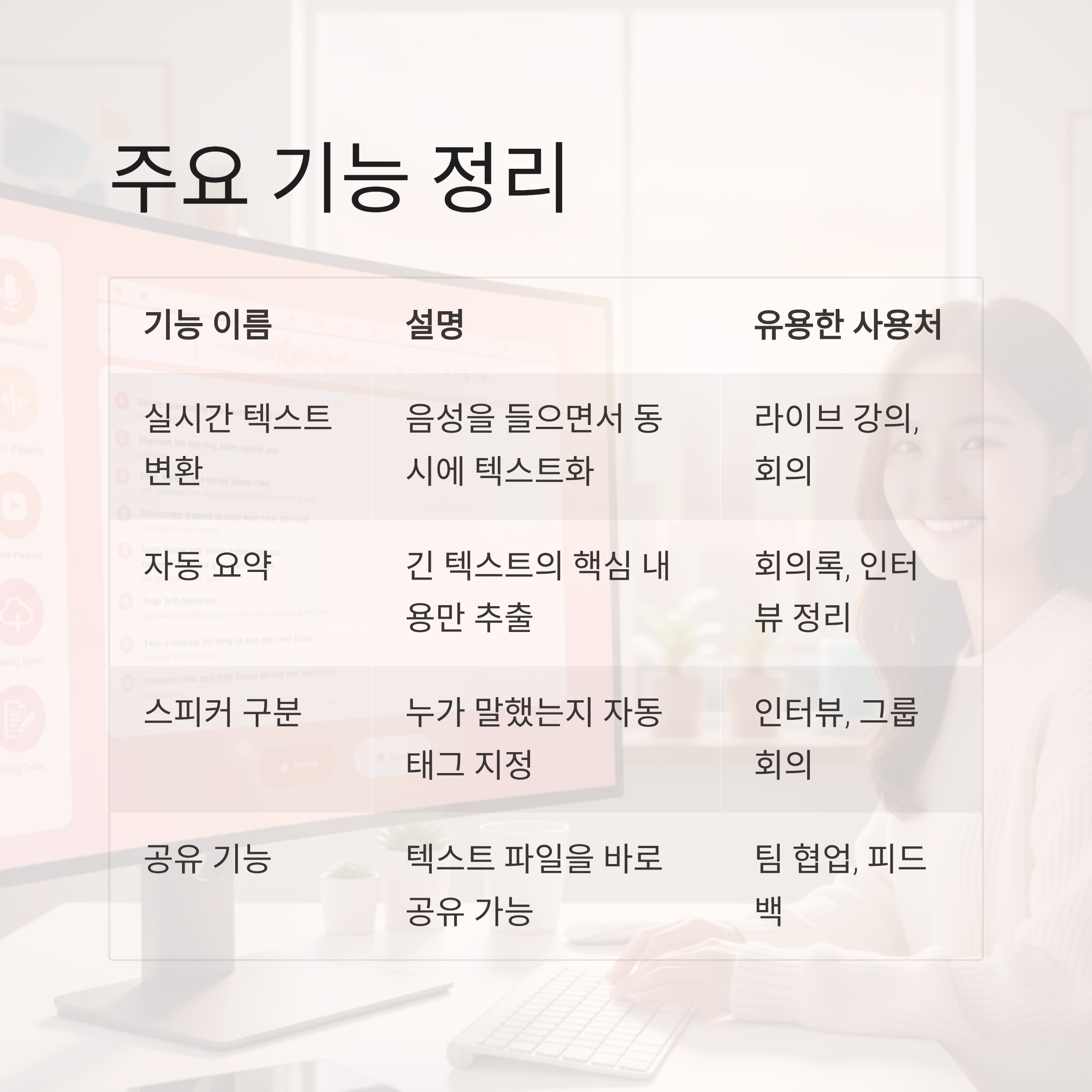| 실시간 텍스트 변환 | 음성을 들으면서 동시에 텍스트화 | 라이브 강의, 회의 중 사용 |