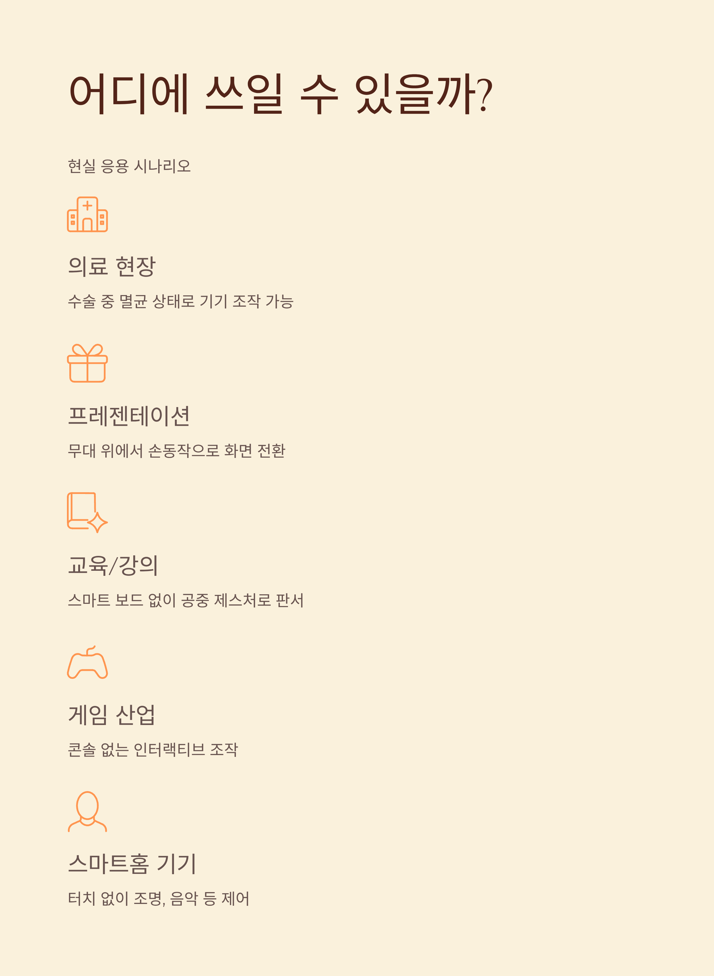 | 교육/강의 | 스마트 보드 없이 공중 제스처로 판서 가능 |