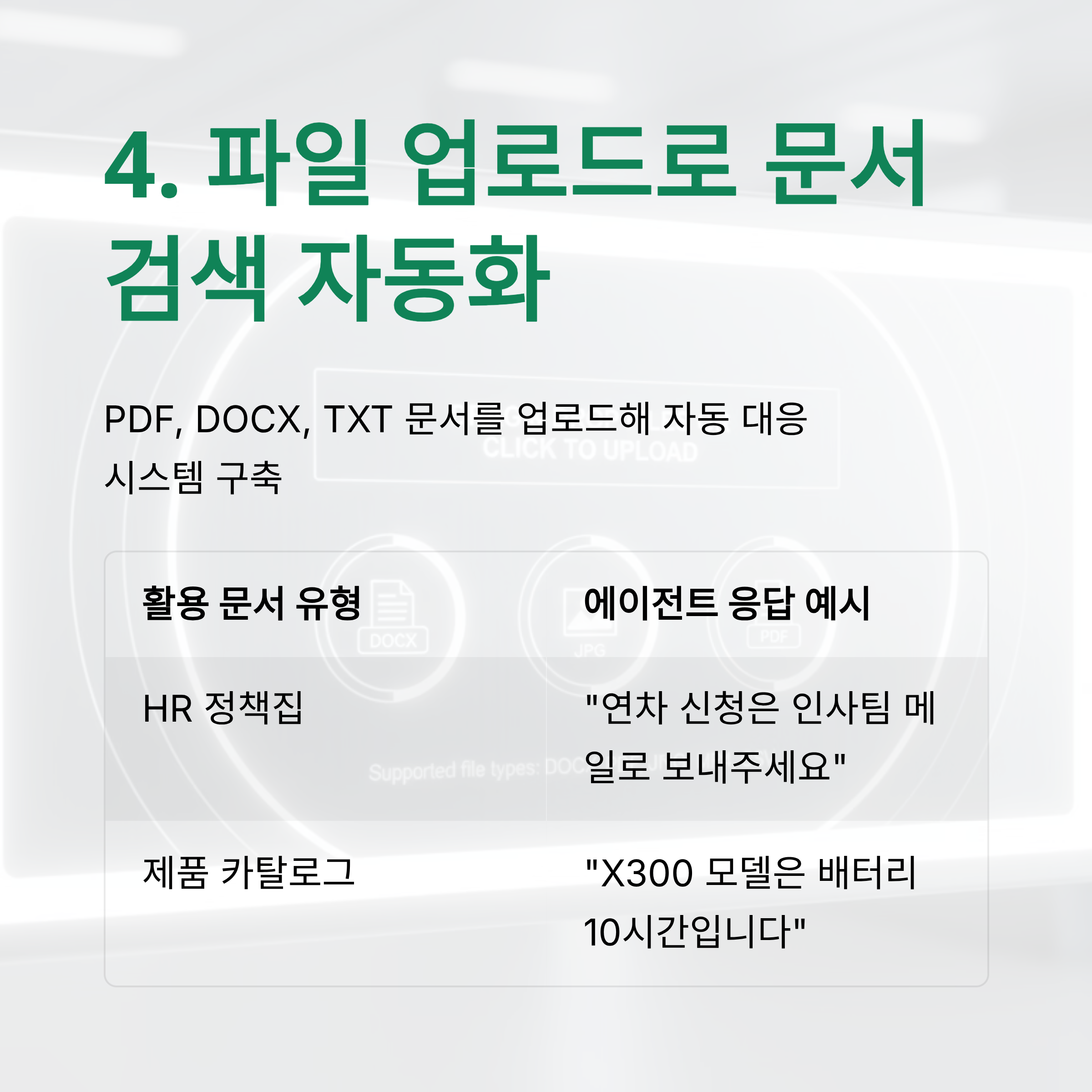 | 문서 업로드 | 정보 검색 자동화 | 정책, 안내서 자동 응답 |