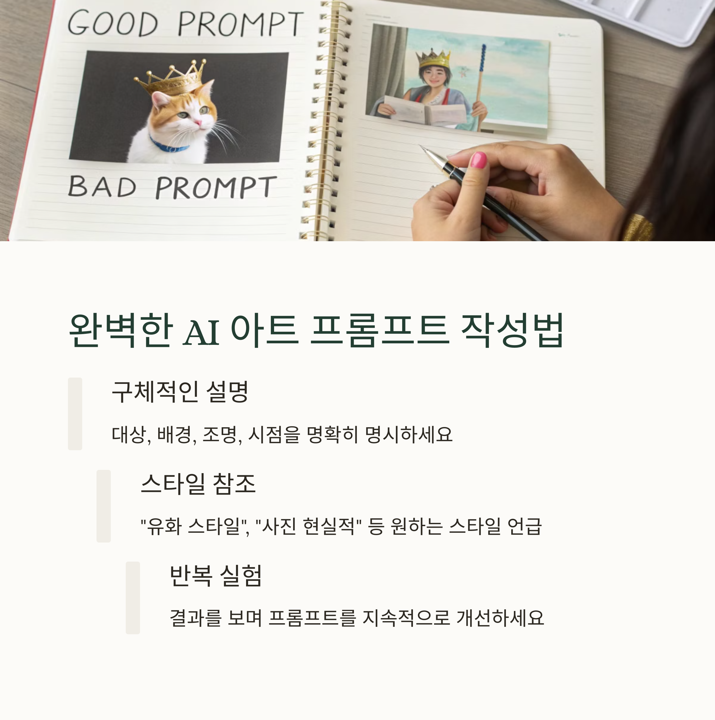 | 스타일을 명확히 | "in the style of Studio Ghibli", "pixel art" 등 |