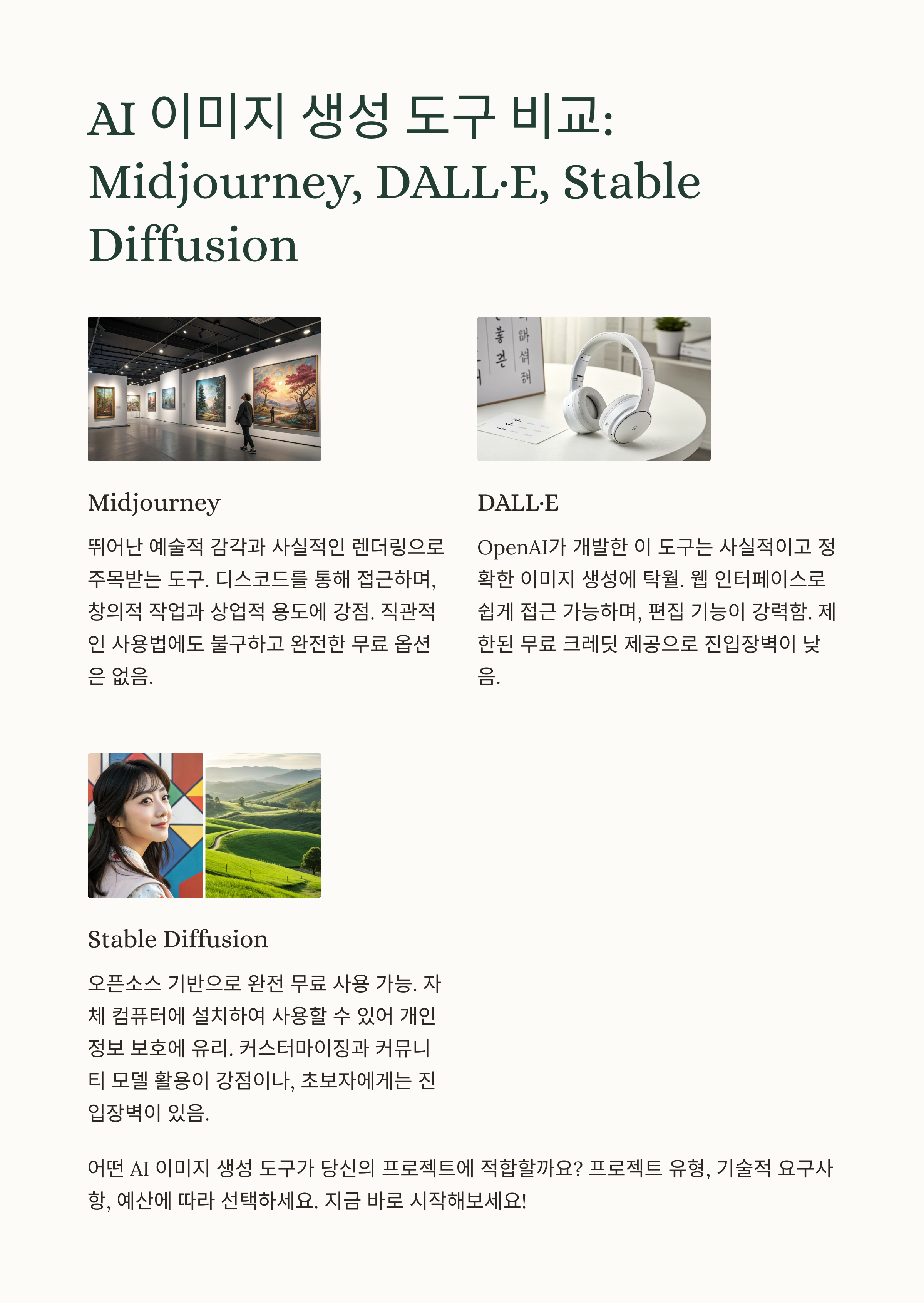 스타일에 따라 달라요. 감성적이고 예술적인 건 Midjourney, 현실적이고 설명 중심이면 DALL·E가 좋아요.