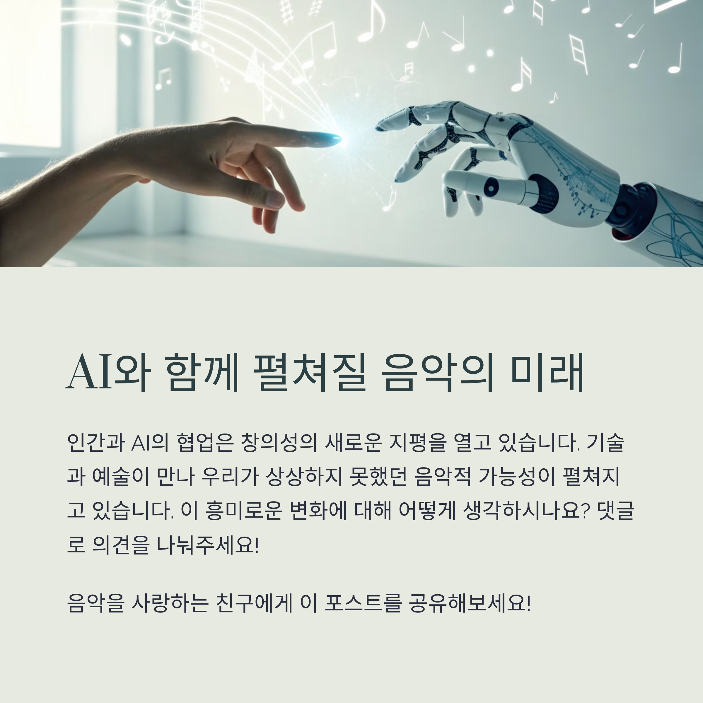 AI가 음악 창작에 미치는 영향, 정말 놀랍지 않나요? 저도 AI 가사를 활용해 곡을 만들면서 매번 새로운 영감을 받곤 합니다. 혹시 여러분도 AI와 함께 음악을 만들어보신 적이 있나요? 아니면 지금 도전해보고 싶은 마음이 드셨나요? 여러분의 경험이나 생각을 댓글로 들려주세요! 음악과 AI의 만남이 앞으로 우리에게 어떤 놀라움을 안겨줄지 함께 기대해봐요.