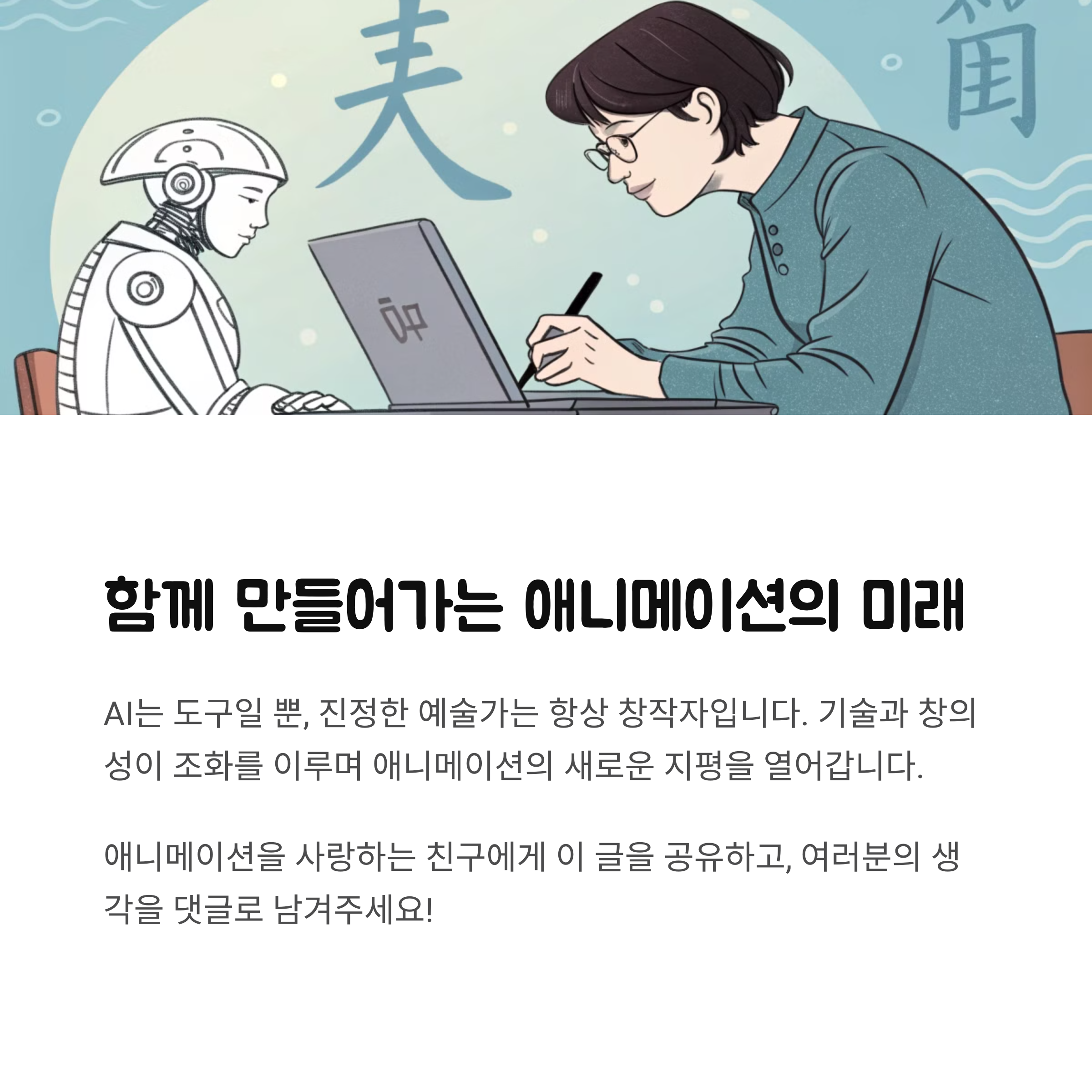 AI가 만든 애니메이션, 처음엔 반신반의했지만 지금은 완전히 매료돼 버렸어요. 물론 아직 부족한 점도 있고, 논란거리도 많지만, 이 흐름은 분명 앞으로 더 커질 거예요. 만약 여러분도 '나만의 캐릭터'를 꿈꾸고 있다면, 이제는 AI가 그 꿈을 함께 그려줄 수 있는 시대랍니다. 댓글로 여러분이 만든 AI 캐릭터나 써본 툴, 공유해주시면 너무 반가울 것 같아요! 다음 포스트에선 AI로 애니메이션 효과까지 주는 방법도 소개해볼게요. 기대해주세요 :)