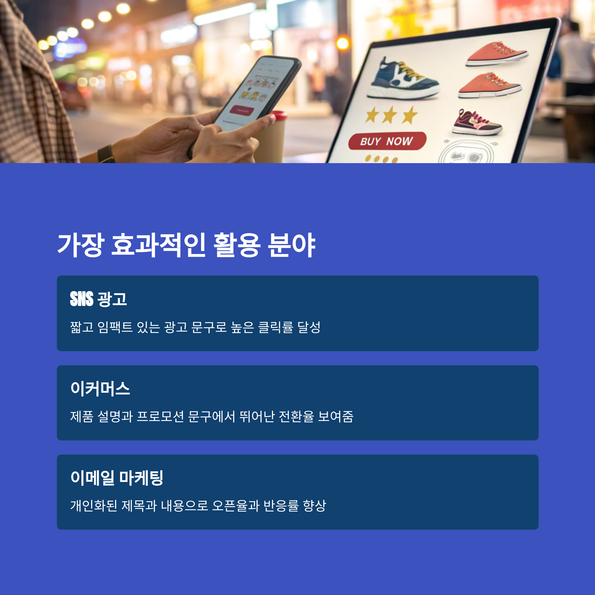 | SNS 광고 문구 | ★★★★★ | 반복 테스트와 A/B 구조로 효과 상승 |