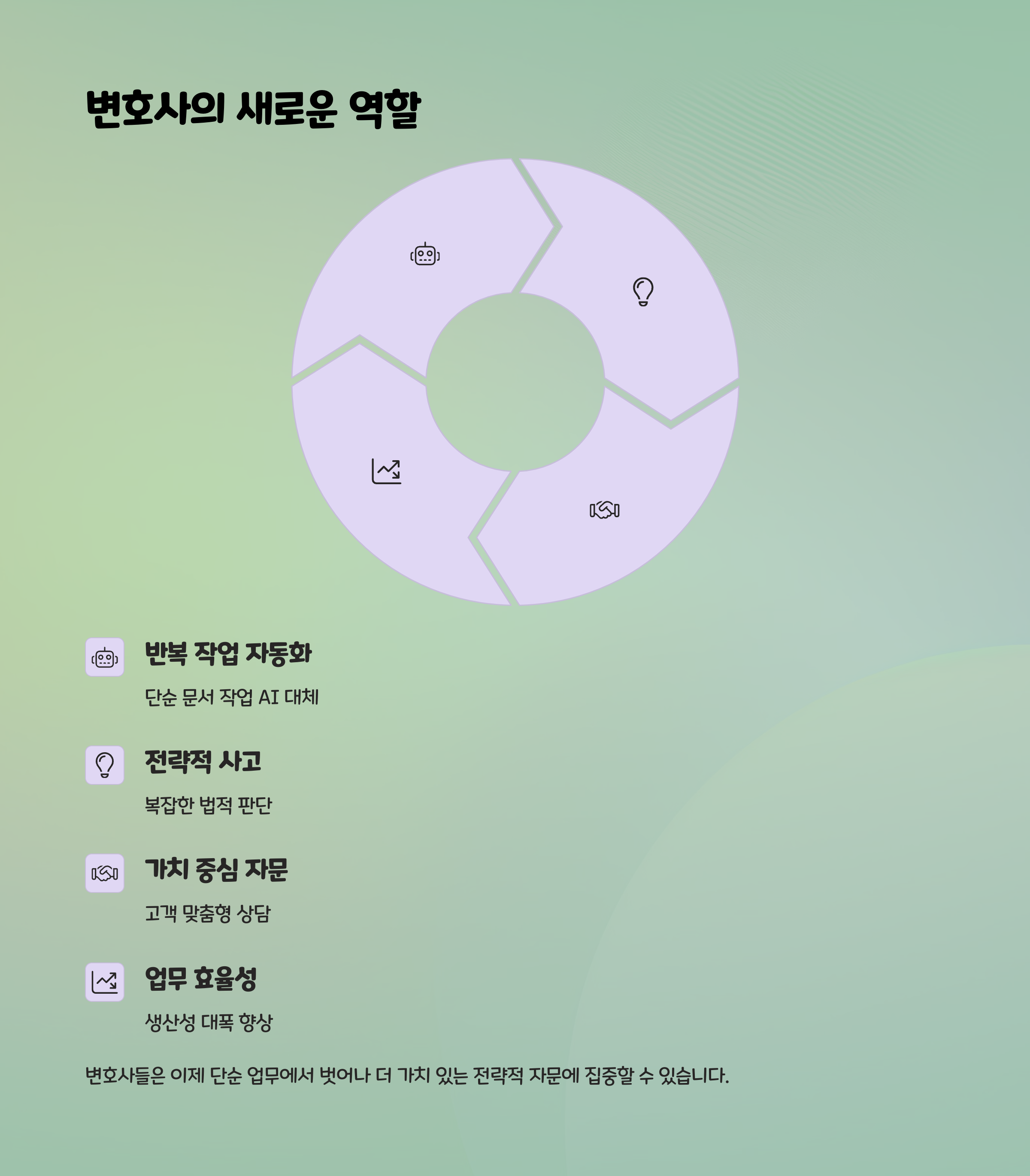 "AI가 변호사 일을 대체할 수 있을까?" 이 질문, 진짜 많이들 하시더라고요. 저도 궁금했어요. 하지만 실제 현장을 들여다보면, 사라지기보다는 진화에 가깝습니다. 반복적인 작업, 예를 들면 표준 계약서 작성 같은 건 AI가 맡고, 변호사는 보다 전략적이고 고차원적인 업무에 집중하게 되는 구조예요.