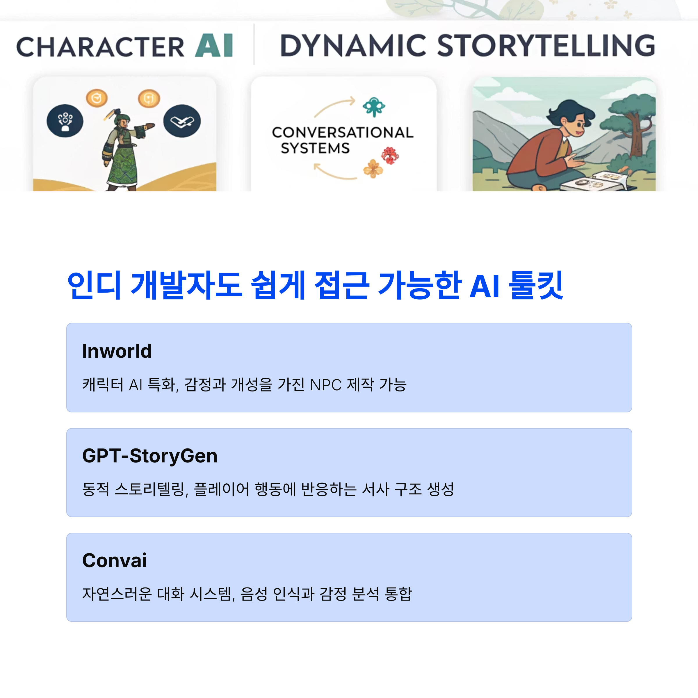 Unity나 Unreal 플러그인 형태로 제공되는 AI 툴킷부터 써보는 걸 추천드려요. Inworld.ai나 Convai 같은 툴은 초보자도 시작하기 좋아요.