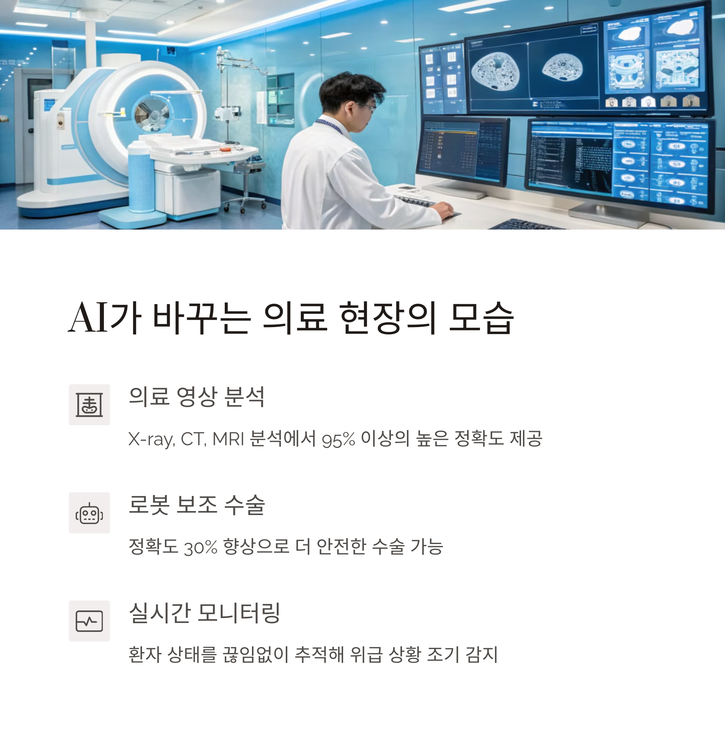 AI는 진단, 치료 계획 수립, 환자 모니터링, 의료 이미지 분석 등 다양한 분야에서 활용되고 있습니다.