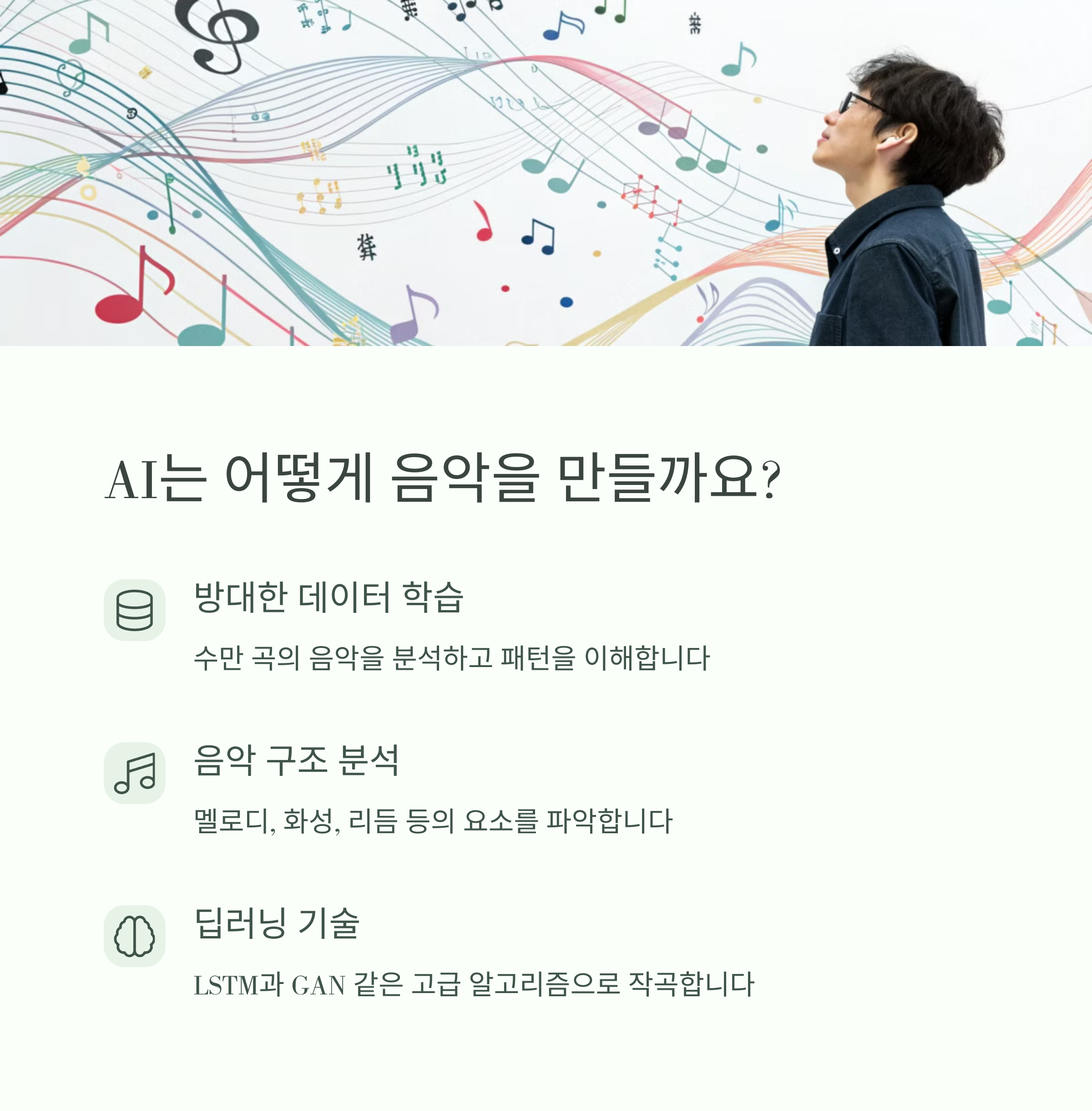 AI는 데이터에 기반해 작곡을 합니다. 수백만 곡의 데이터를 학습하면서 멜로디, 코드 진행, 리듬 패턴 등을 분석하고 이를 토대로 새로운 곡을 만들어내죠. 흔히 사용하는 기술은 딥러닝과 머신러닝으로, 특히 LSTM(Long Short-Term Memory) 네트워크가 대표적이에요. 최근에는 GAN(생성적 적대 신경망)을 활용한 AI 작곡도 늘고 있답니다.
