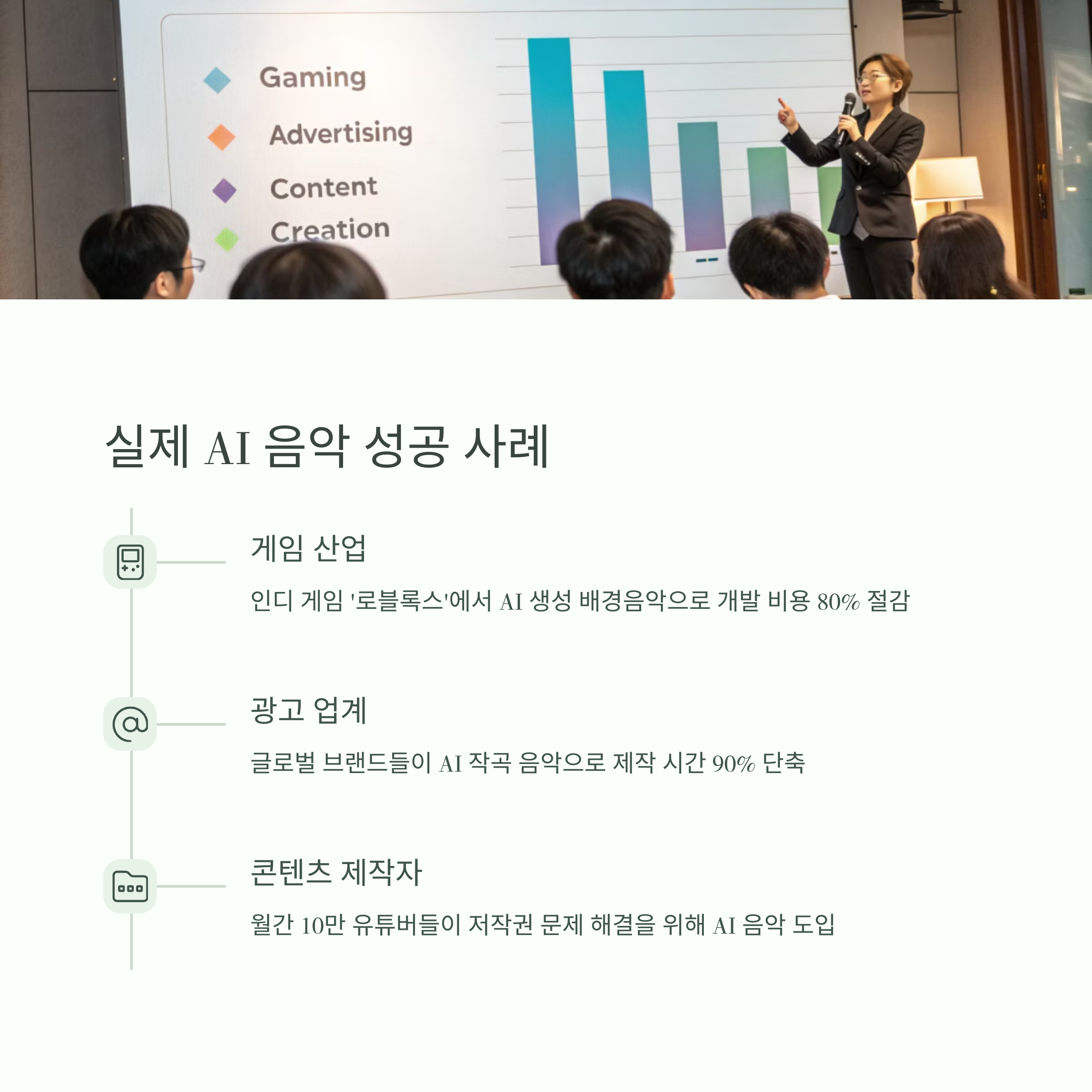 AI 작곡은 이미 다양한 분야에서 활용되고 있어요. 예를 들어, 엔비디아는 AI를 활용해 영화 트레일러 음악을 제작했고, 세계적인 음반사들도 AI가 만든 앨범을 발매하기 시작했죠. 또, 유튜브에서는 AI가 만든 '로파이(Lo-Fi)' 트랙들이 수백만 조회수를 기록하기도 했어요. AI 음악은 이제 단순한 실험 단계를 넘어 실전 무대에서 활약하고 있는 셈이에요.