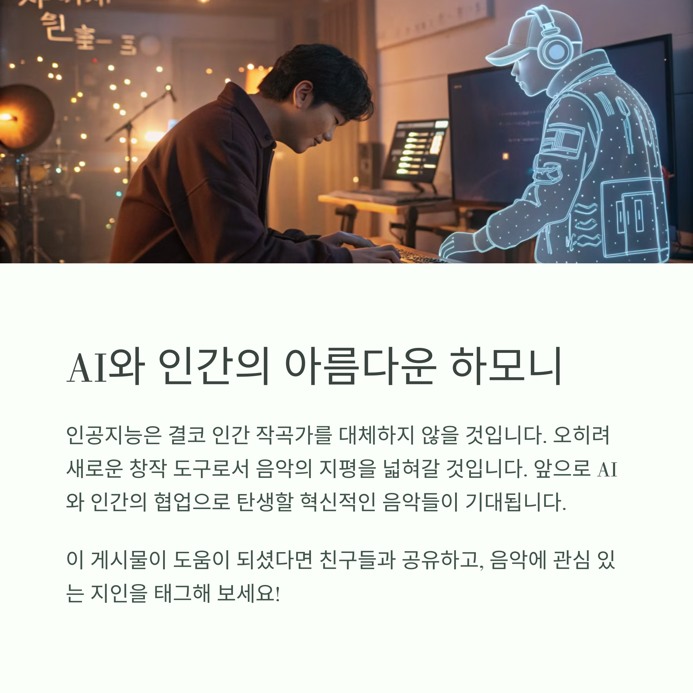 AI가 점점 더 인간처럼 감정을 이해하고 표현할 수 있을까요? 앞으로 AI가 음악 제작의 메인 스트림으로 자리잡을 가능성이 높습니다. 다만, 인간의 예술적 감성과의 조화가 큰 화두가 될 거예요.